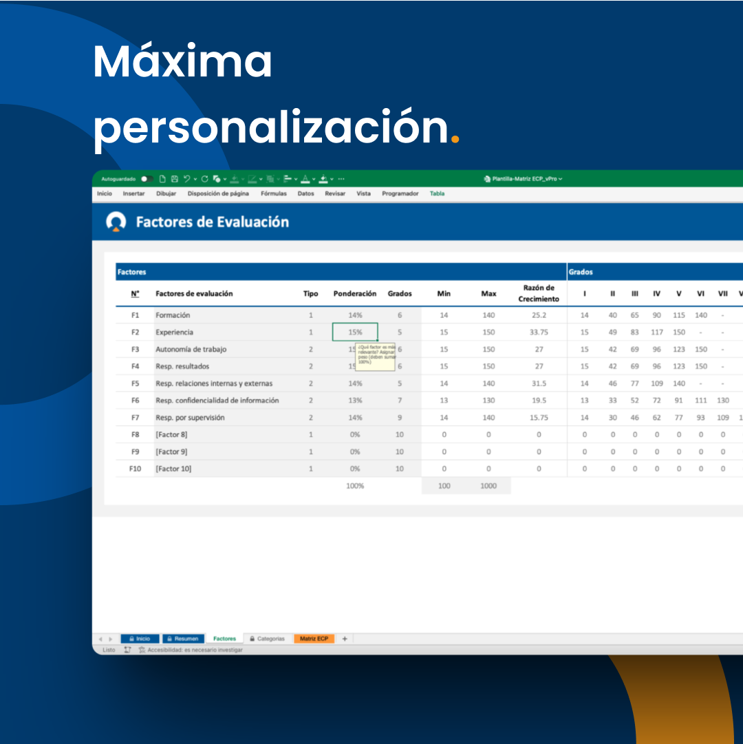 Ideal para equipos de RR.HH. que buscan implementar una estructura interna de compensaciones, así como para consultores que necesiten una herramienta sólida y personalizable en sus proyectos.